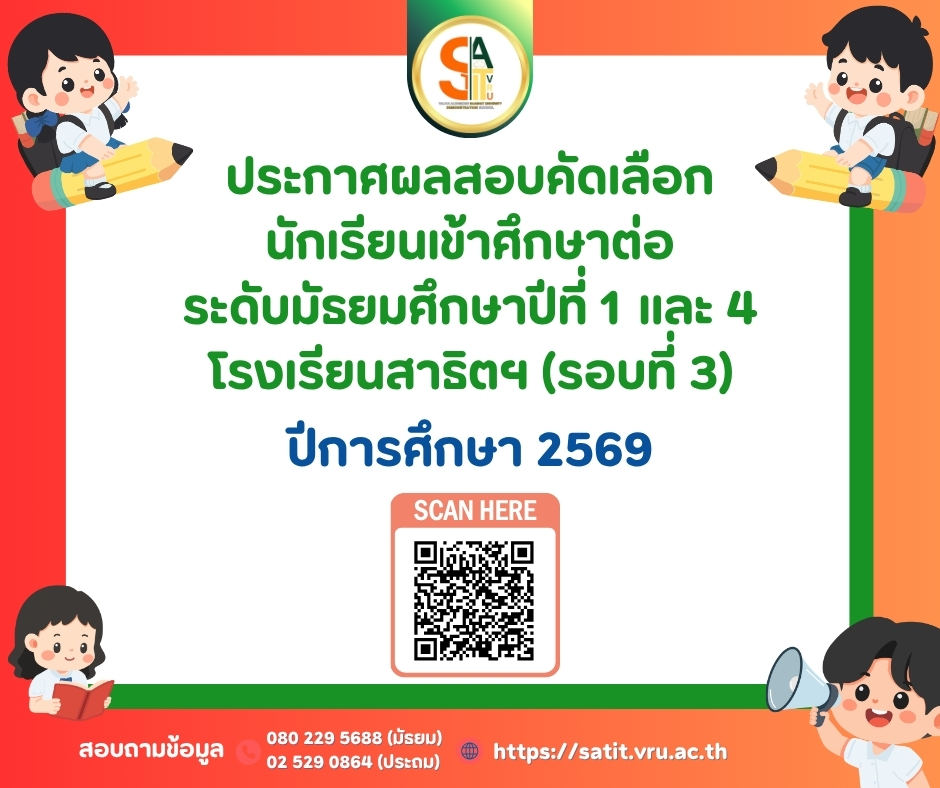 ประกาศ ประกาศรายชื่อนักเรียนที่ผ่านการคัดเลือกเข้าศึกษาต่อระดับชั้นอนุบาล-ประถมศึกษา (รอบ ๒) ปีการศึกษา ๒๕๖๙17 มีนาคม 256917 มีนาคม 2026อ่านเพิ่มเติม....→